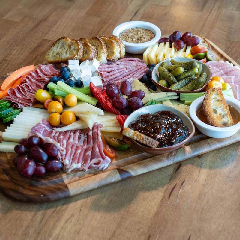 The Chef created Charcuterie Boards consist of high-quality European and domestic meats and cheese with fresh fruit and vegetables, cornichon, nuts (optional), olives, and a trio of spreads (French fig jam, local honey, and multi-grain mustard served with crostini.